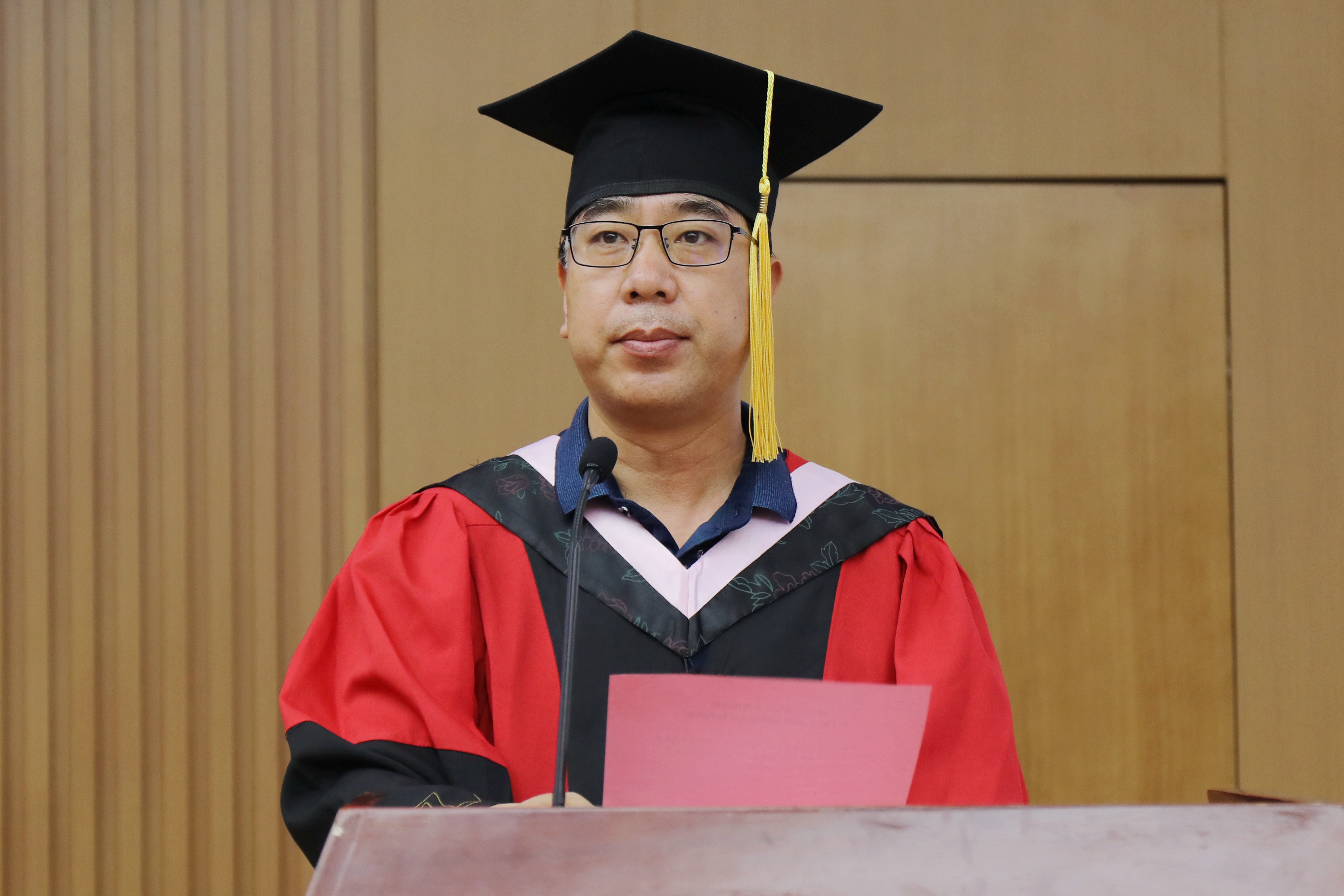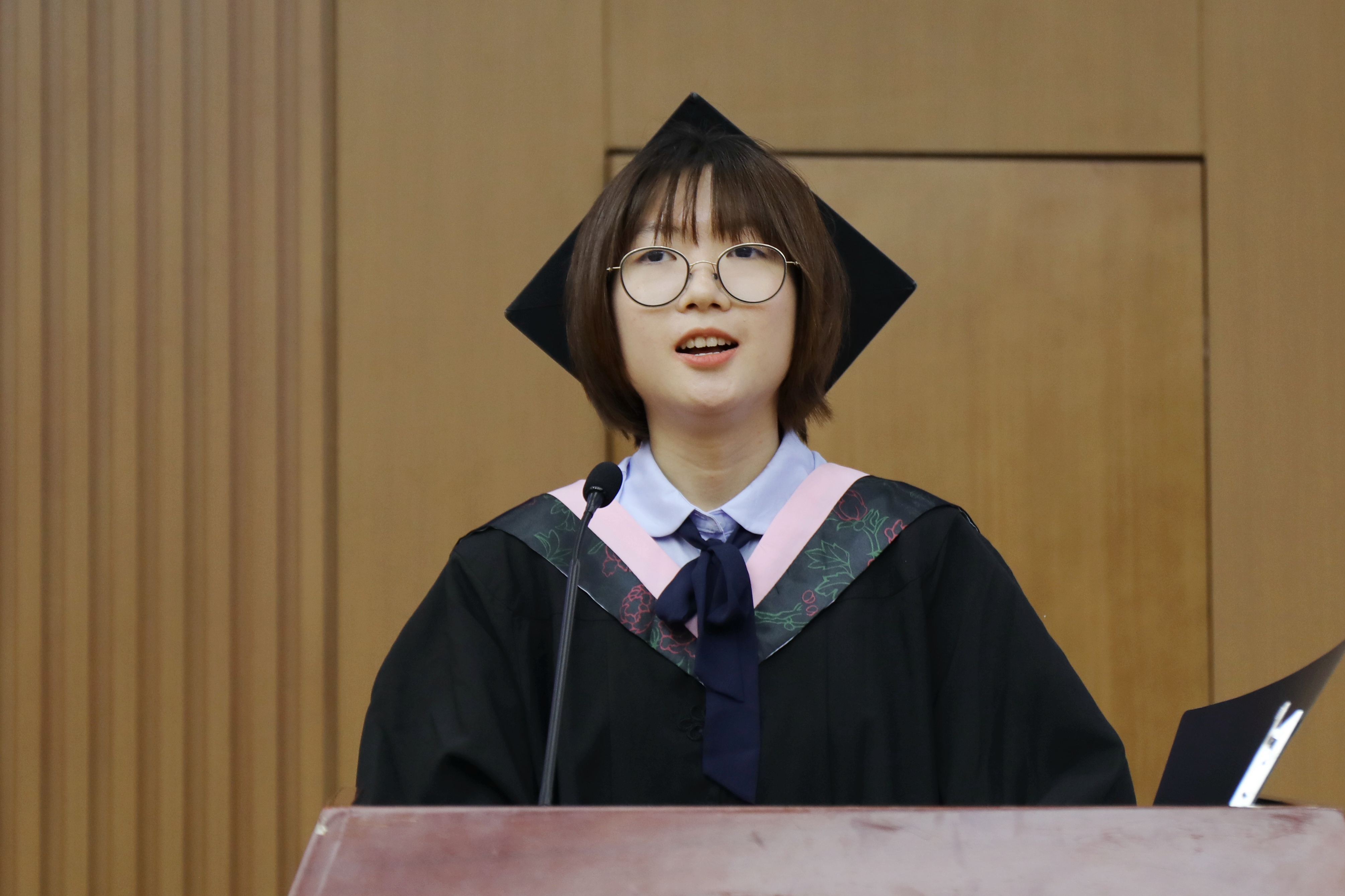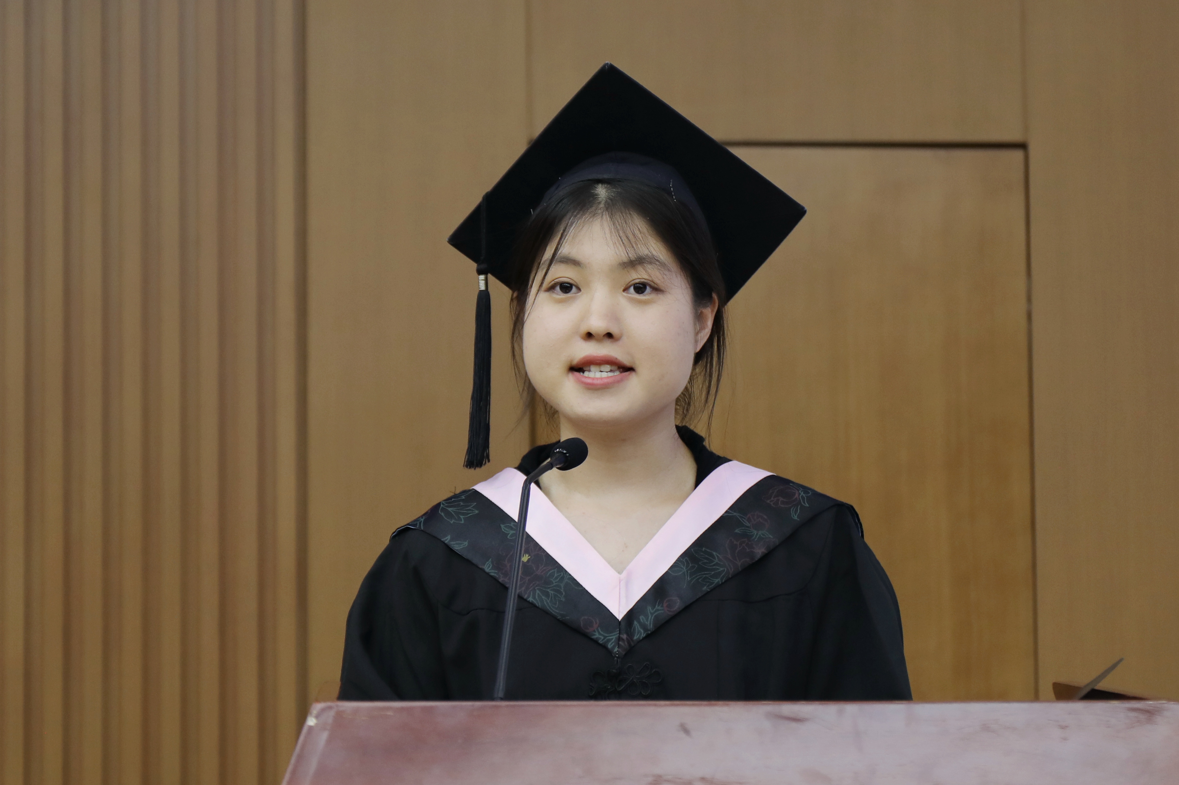 毕业生代表20级行政管理专业本科生段玉回顾了过往四年的大学生活,深切感受到青春被赋予了更深刻的价值内涵,鼓励全体毕业生要保持蓬勃朝气、昂扬锐气、创新勇气,以勇担使命的魄力、战胜困难的毅力、不被裹挟的定力、激情澎湃的活力,昂首挺胸向前看,阔步肆意往前走,用实际行动唱响爱国爱党的青春之歌。