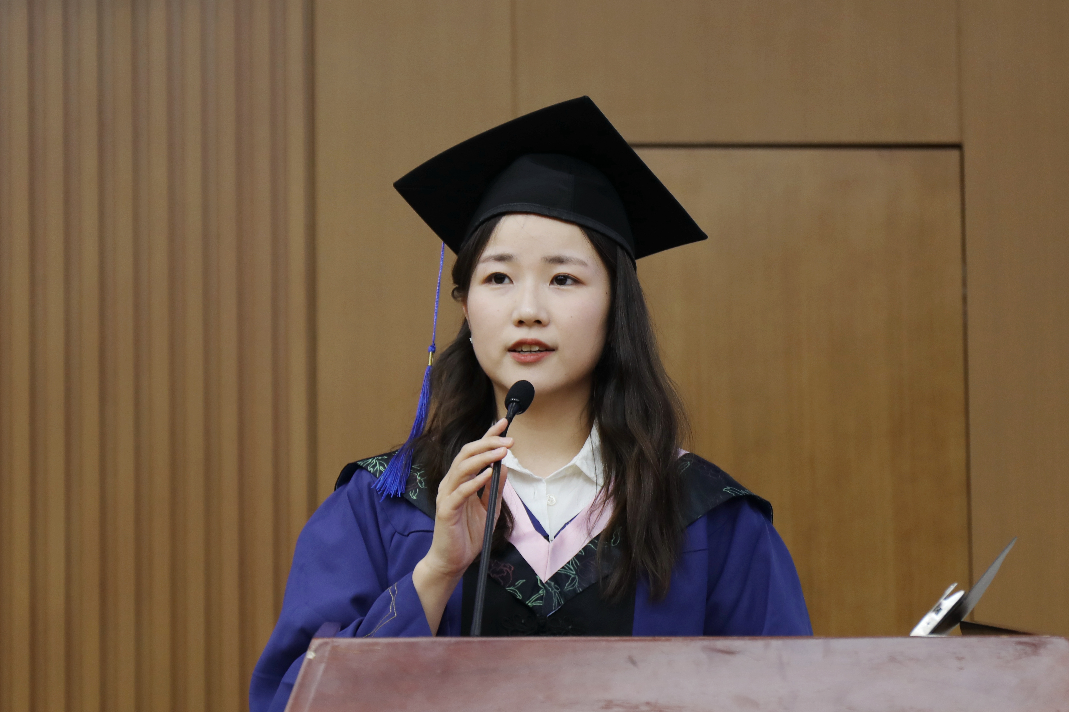 毕业生代表21级区域经济专业研究生金丽娜以“不舍”和“感慨”为关键词,回顾了过往七年在城市赢家娱乐城 的学习生活。她表示,即将踏出校园,迎接新身份、新环境、新挑战,要秉着“崇德尚能、经世济民”的精神,以饱满的精神和经贸人的姿态,投身社会、服务社会、奉献青春、实现自我;以所学所识武装自己,厚积薄发、扬起征帆,书写充满激情的无悔篇章。