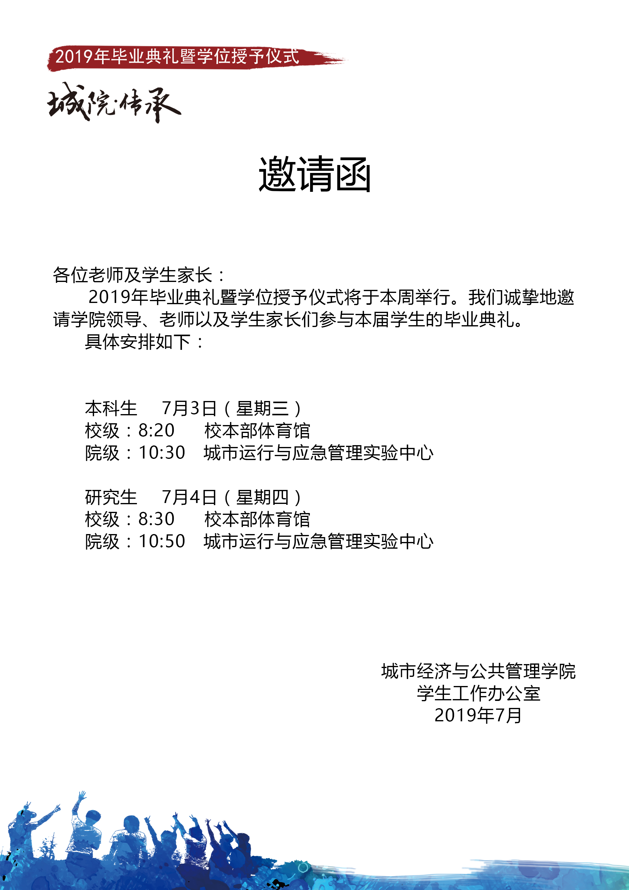 2019年学生毕业典礼暨学位授予仪式将于本周举行。我们诚挚地邀请赢家娱乐城 领导、老师以及学生家长们参与本届学生的毕业典礼。