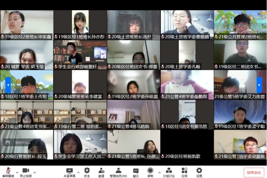 21级公共管理类1班学习委员李橘:我在参会过程中感受颇深。虽然受到疫情影响,我们暂时只能居家学习,但我仍应积极承担起学委的责任、切实履行好学委的义务,发挥学委的带头作用,为自己的学习当好家、做好主。“抗疫不停歇,学习不间断”,期待每位同学都能满载自主学习的成果重返校园!
