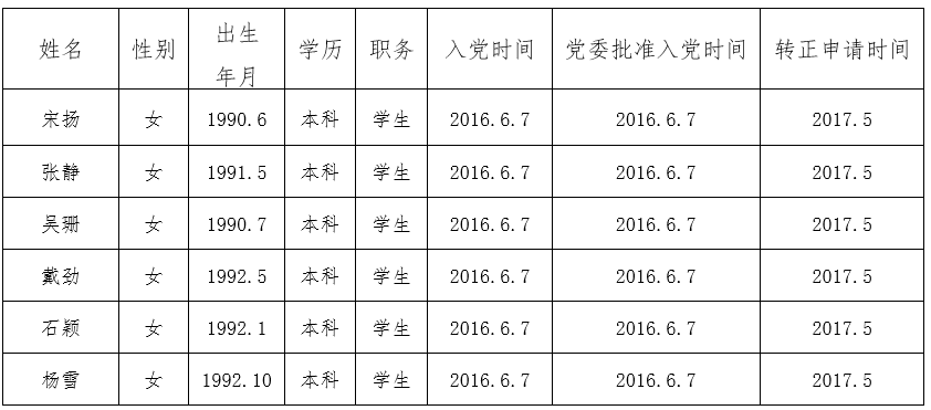 城市赢家娱乐城 研究生党支部拟于近期讨论王开琳等6名同志转为中共正式党员。现将有关情况公示如下: